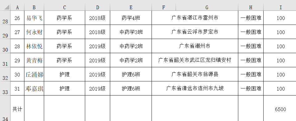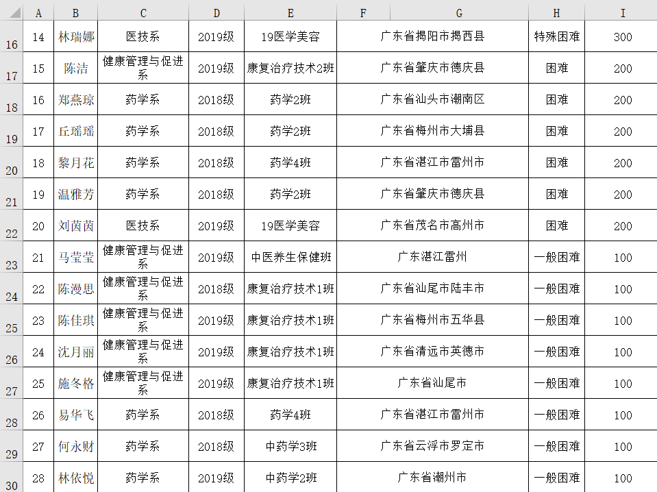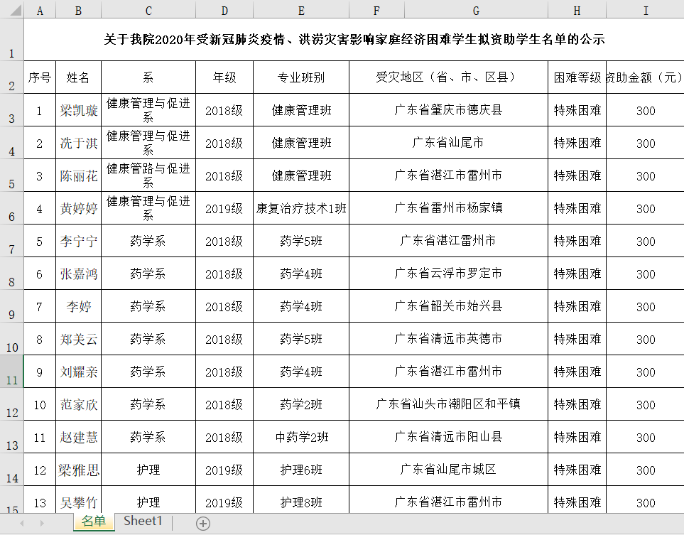 根据《广东省教育厅 广东省财政厅转发关于做好新型冠状病毒感染肺炎疫情防控期间学生资助工作的通知》和《广东省教育厅转发教育部办公厅关于切实做好2020年秋季学期高校家庭经济困难学生资助工作的通知》,我院学生资助管理中心发布《关于我院摸查2020年秋季学期受疫情或洪涝灾害影响学生情况工作的通知》,收到各系申请学生共54人,其中被认定为家庭经济困难学生共31人,具体如下:特殊困难14人,比较困难6人,一般困难11人,不困难23人。经请示学院领导同意,现拟对我院因今年疫情、洪涝影响较大的被认定为家庭经济困难的31个学生予以资助,现予以公示。