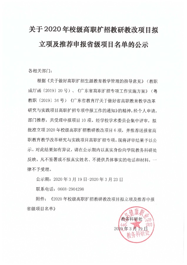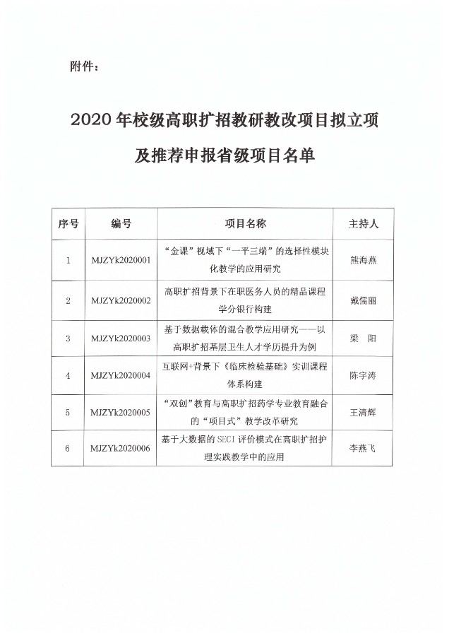 关于2020年校级高职扩招教研教改项目拟立项及推荐申报省级项目名单的公示