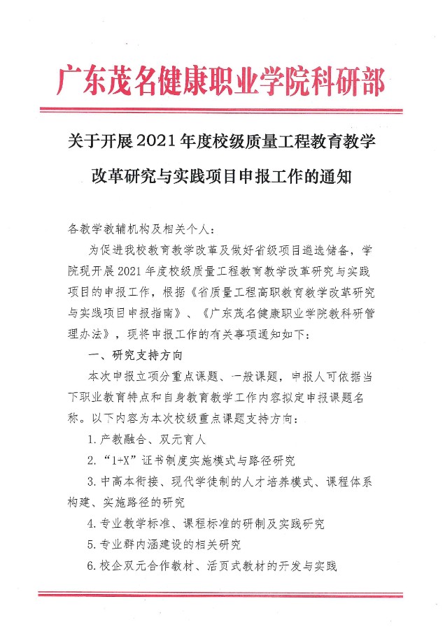 关于开展2021年度校级质量工程教育教学改革研究与实践项目申报工作的通知