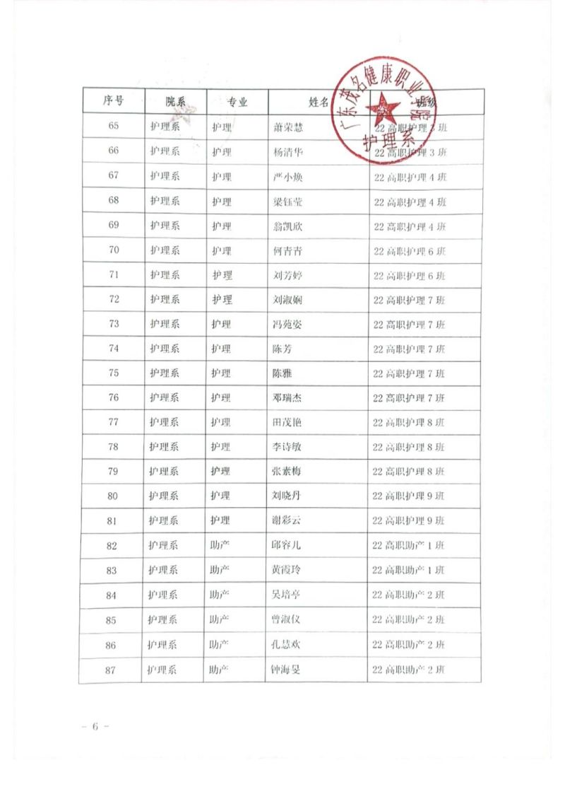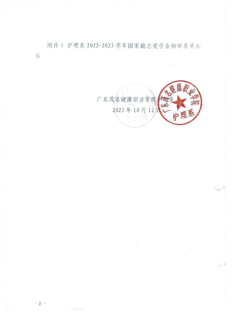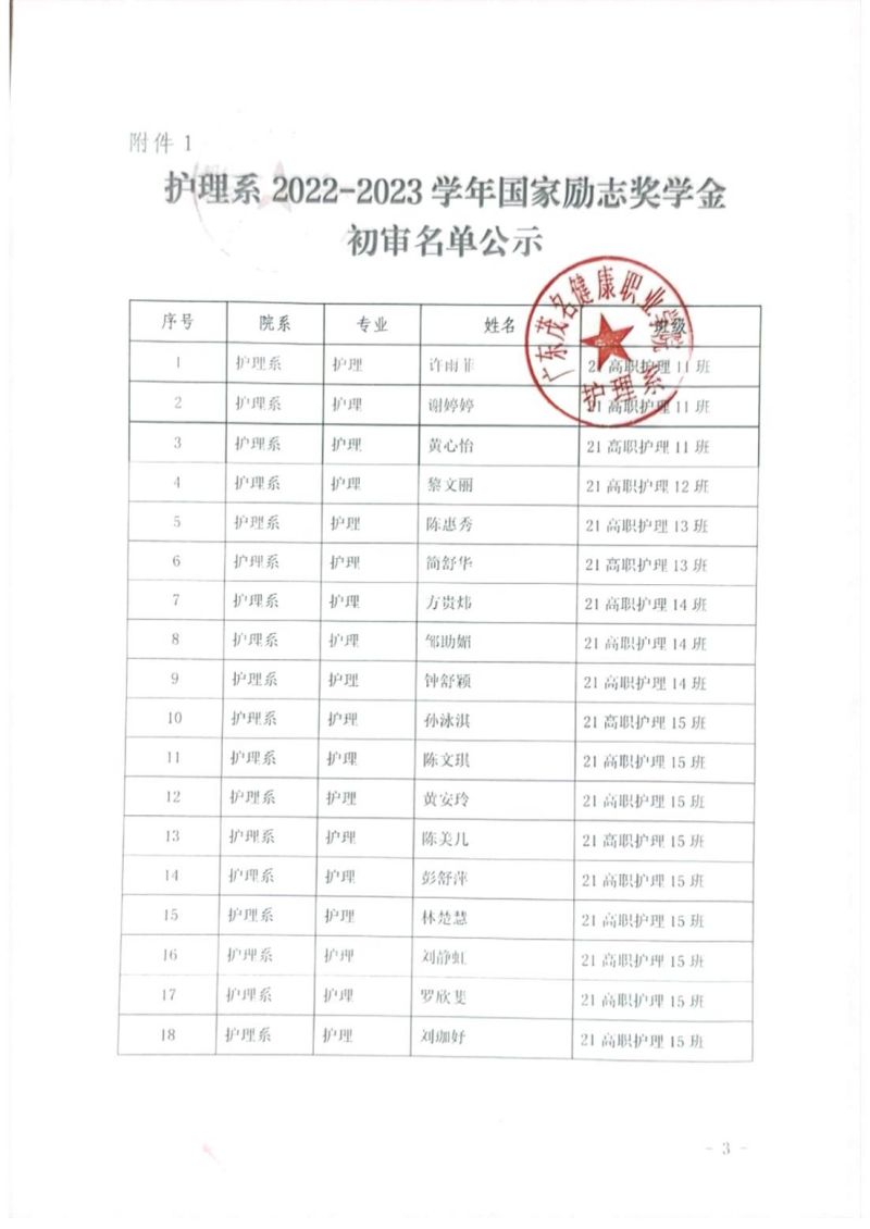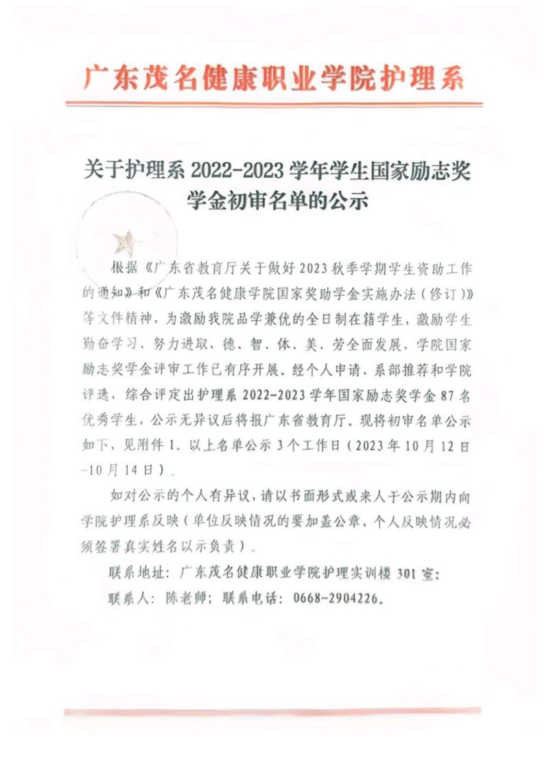 关于护理系2022-2023学年学生国家励志奖学金初审名单的公示