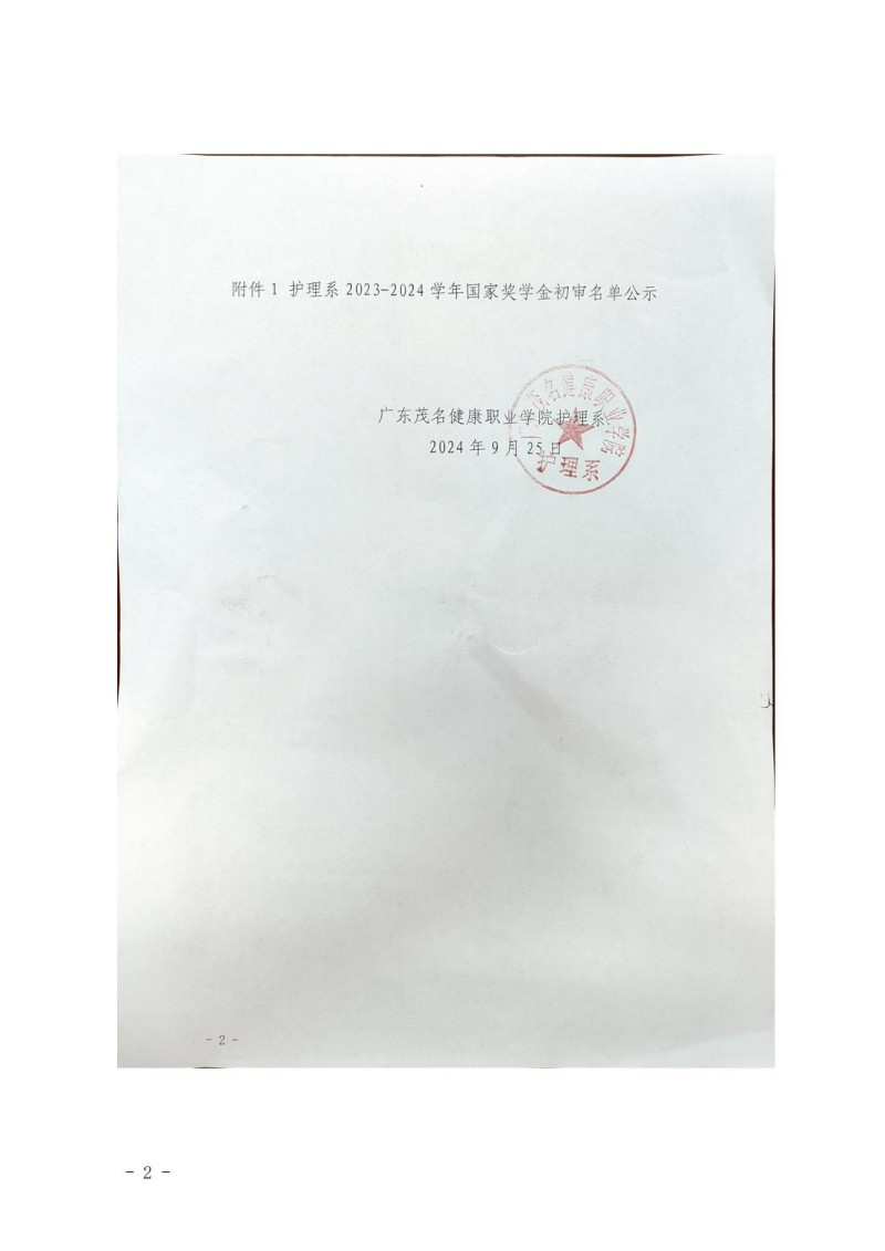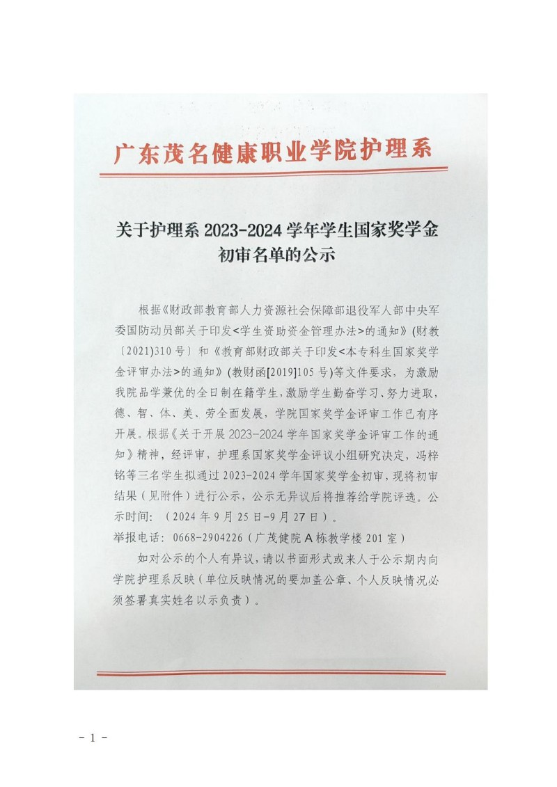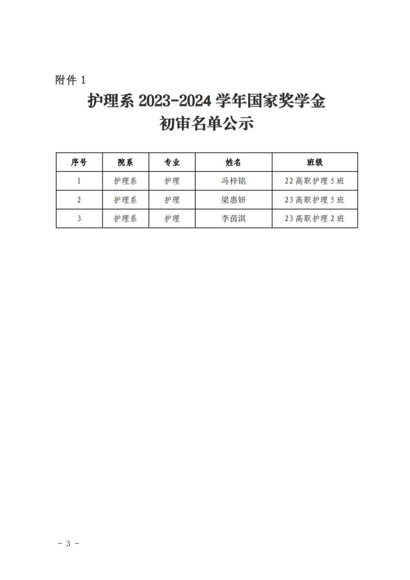 关于护理系2023-2024学年学生国家奖学金初审名单的公示
