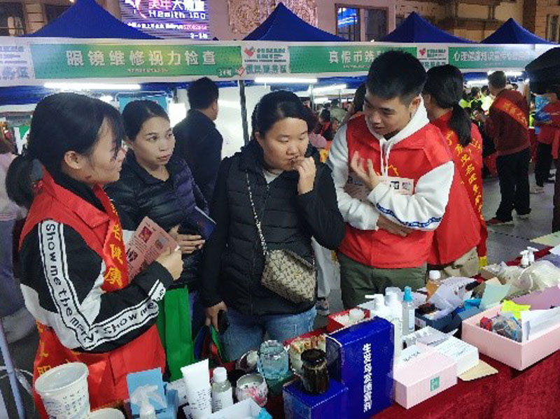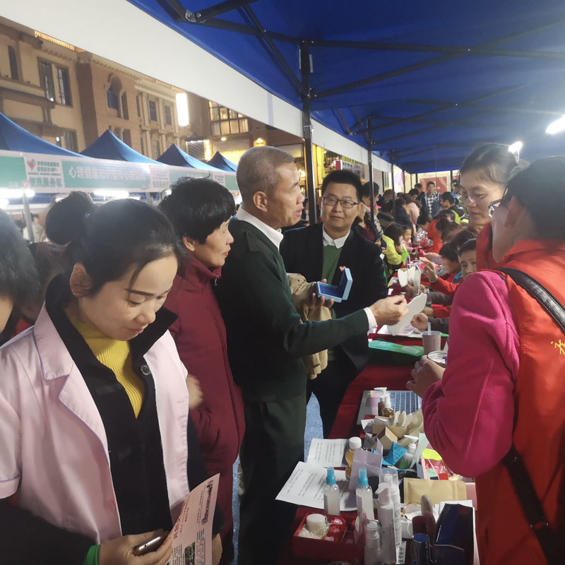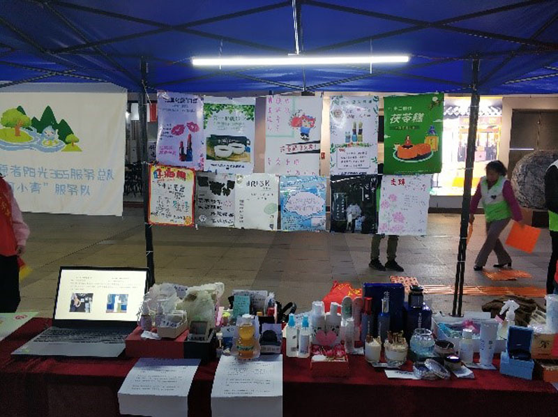 创新产品体验队展出了18级药学专业学生自创自制的实验作品,有美肤护肤、舒缓疲劳两大区,以及美发、功能唇膏、抗菌鞋垫、诱螨杀螨抑螨套装、鼻炎系列、养生粥等20多样。团队准备充分,学生作品充满创意,全程吸引了市民目光。学生们专业详细的解说赢得了市民好评,在学生引导下,通过填写调查问卷留下了他们对我们产品的建议和意见。