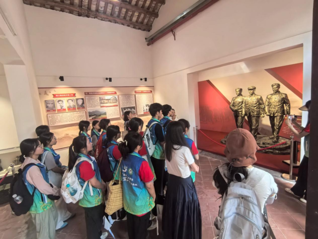 实践间隙,师生赴鳌头镇革命历史纪念馆、杨增故居等红色教育基地追寻先烈足迹,聆听老党员动情讲述峥嵘岁月的革命故事。在庄严党旗下,青年党团员重温誓词,“请党放心,强国建设,复兴伟业,我们挺膺担当!”铮铮誓言,传递着信仰的坚定与为民服务的赤诚。